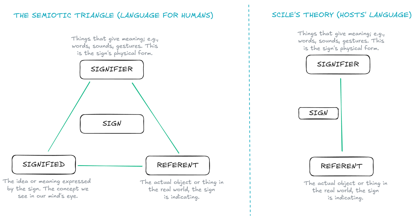For us humans, every word is a triangle where one side is the signifier, another the signified, and the last one the referent; the total of these three elements composes a sign.
