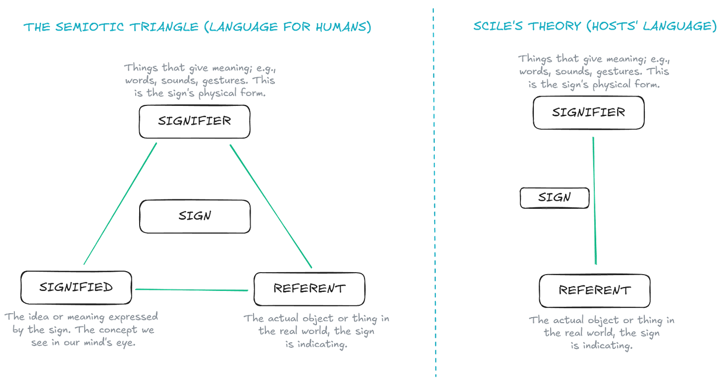 For Hosts, every word in Language is a line: one end is the signifier (the sound-symbol) and the other the referent… and that’s it.