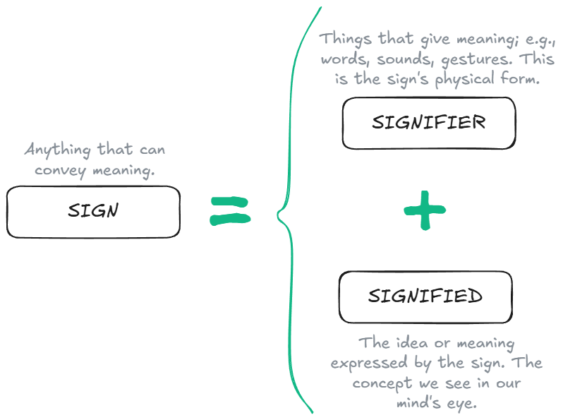 At the basics, every word in a language is a combination of sounds (speech), translated into a notation (written word or hand-signals). The famous linguist, Ferdinand de Saussure3, defined these elements as the signifiers. For example, imagine a post-it note with the letters