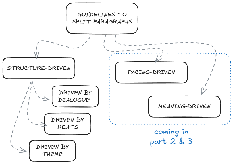 Paragraphs are one of the fundamental structures of a story. This is the first part of a two-volume essay discussing guidelines for splitting paragraphs, considering structure-driven rules.