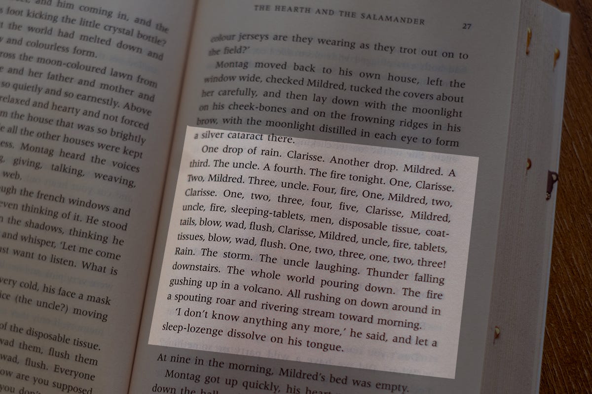 Fahrenheit 451 is narrated in third-person past-tense, but the narrator is not omniscient—it is a very close-quarter narrative representing Guy Montag’s thoughts. This is crucial to gauge the impact of the passage we’re about to analyse.